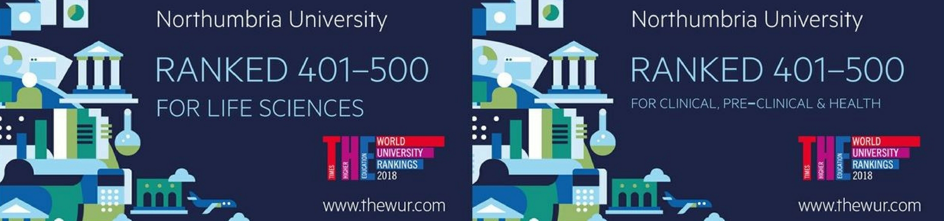 Northumbria features in the top 500 in the 2018 Times Higher Education in both the Clinical, Pre-Clinical & Health subject ranking and in the Life Sciences subject ranking. The University performed particularly well in the metrics for research citations and industry income respectively.