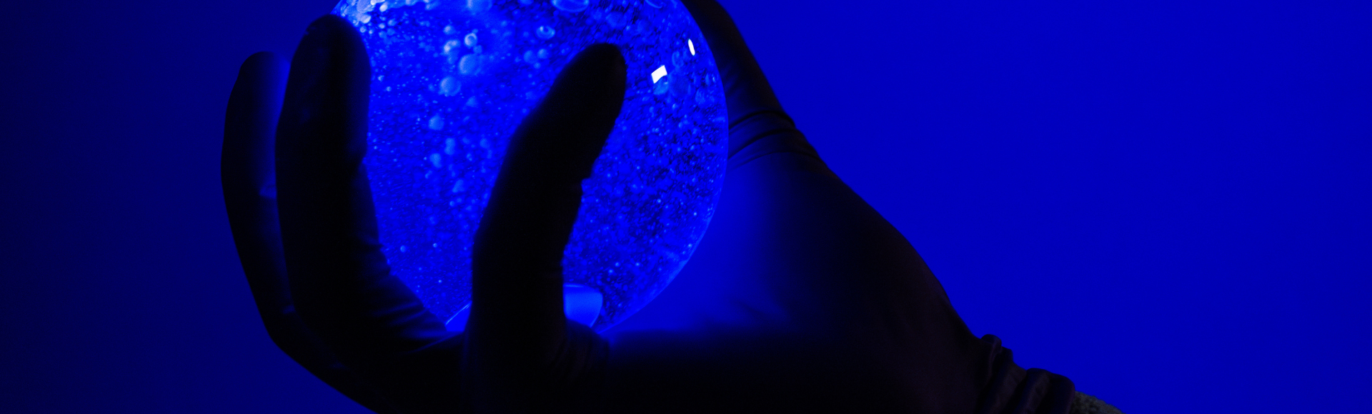 Blue banner image at top of page - a solution of the new molecule glowing under UV light: Craig Yu and Petri Murto